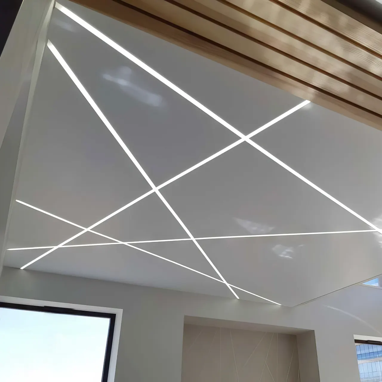 Натяжные потолки со световыми линиями - это эффектный способ добавить в интерьер мягкое и равномерное освещение. Внутри полупрозрачного полотна размещены светодиодные ленты, создающие светящиеся полосы на уровне потолка. Такие потолки экономят электроэнергию, служат основным или дополнительным источником света, помогают зонировать пространство и акцентировать внимание на деталях интерьера.