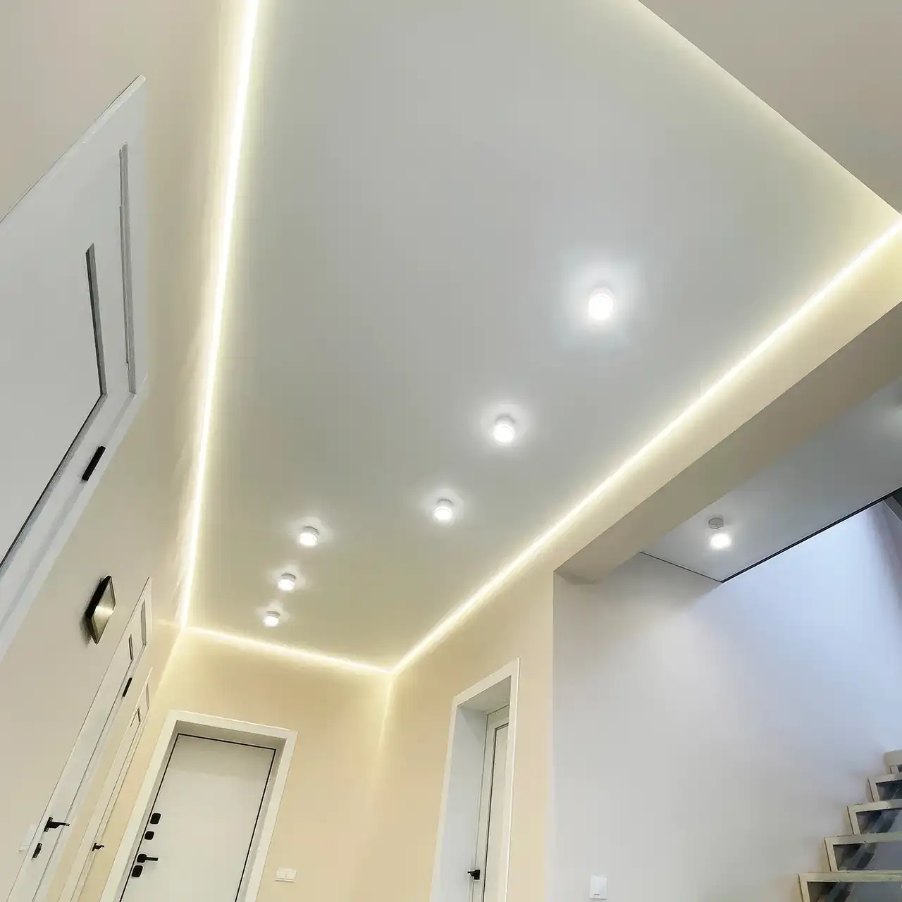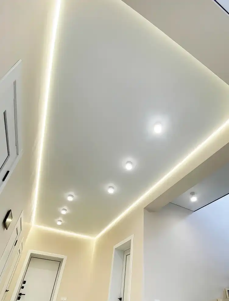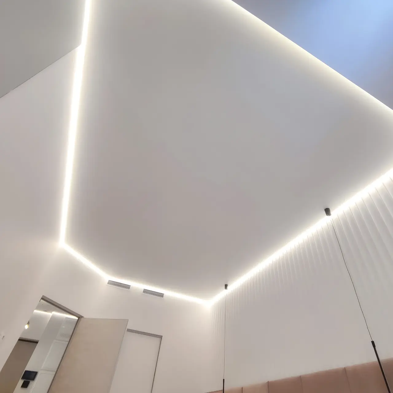 Свет от лент отражается от полотна натяжного потолка, создавая впечатление, что потолок парит в воздухе.